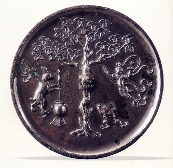圆形月宫镜画面组合的另外一种形式为:左嫦娥,中桂树,右玉兔(蟾蜍),这种组合形式的月宫镜发现数量相对较少。